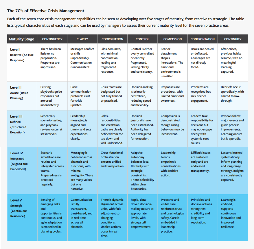 In other words, crisis capabilities can be understood as maturing across five stages that we characterize as reactive, aware, defined, integrated, and strategic. In the reactive stage, organizations rely on improvisation. There are no formal plans or roles, and responses depend on individual initiative — what one CEO called “firefighting with no water.” In the aware stage, the organization recognizes the need for structure. Playbooks may already exist, but they are rarely used or tested, and planning remains largely symbolic. The defined stage marks the first step toward institutional discipline: Standardized processes, rehearsals, and scenario testing transform plans from paper exercises into operational routines. At the integrated stage, capabilities become embedded across functions; cross-departmental simulations are routine, decision rights are clear, and early warning systems link detection to coordinated action. Finally, in the strategic stage, preparedness becomes anticipatory rather than reactive. The organization develops proactive sensing mechanisms, embeds agility into its governance system, and treats resilience as a source of strategic advantage to be nurtured and protected.
